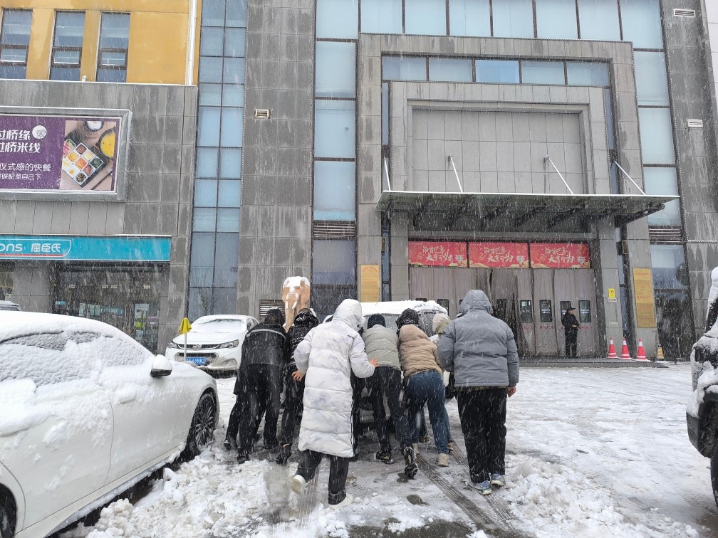 華百電影文化廣場(chǎng)外,大雪依舊飄飄灑灑、尚未停歇的時(shí)候,華百商管和物業(yè)人員就已經(jīng)踏上了清掃積雪的征程。在掃雪過(guò)程中,偶遇因積雪厚重而無(wú)法前行的車(chē)輛,他們毫不猶豫地放下手中的工具,匯聚成一股強大的合力,齊心協(xié)力推車(chē)前行,一邊精準指揮車(chē)輛,一邊奮力推動(dòng),最終成功助力車(chē)輛脫困。為防止影響車(chē)牌的錄入,物業(yè)人不懼寒冷,徒手將一個(gè)個(gè)車(chē)牌上的積雪清除,這一暖心之舉,不僅贏(yíng)得了車(chē)主由衷的感激,更讓市民深切感受到了長(cháng)田人的溫暖與力量。