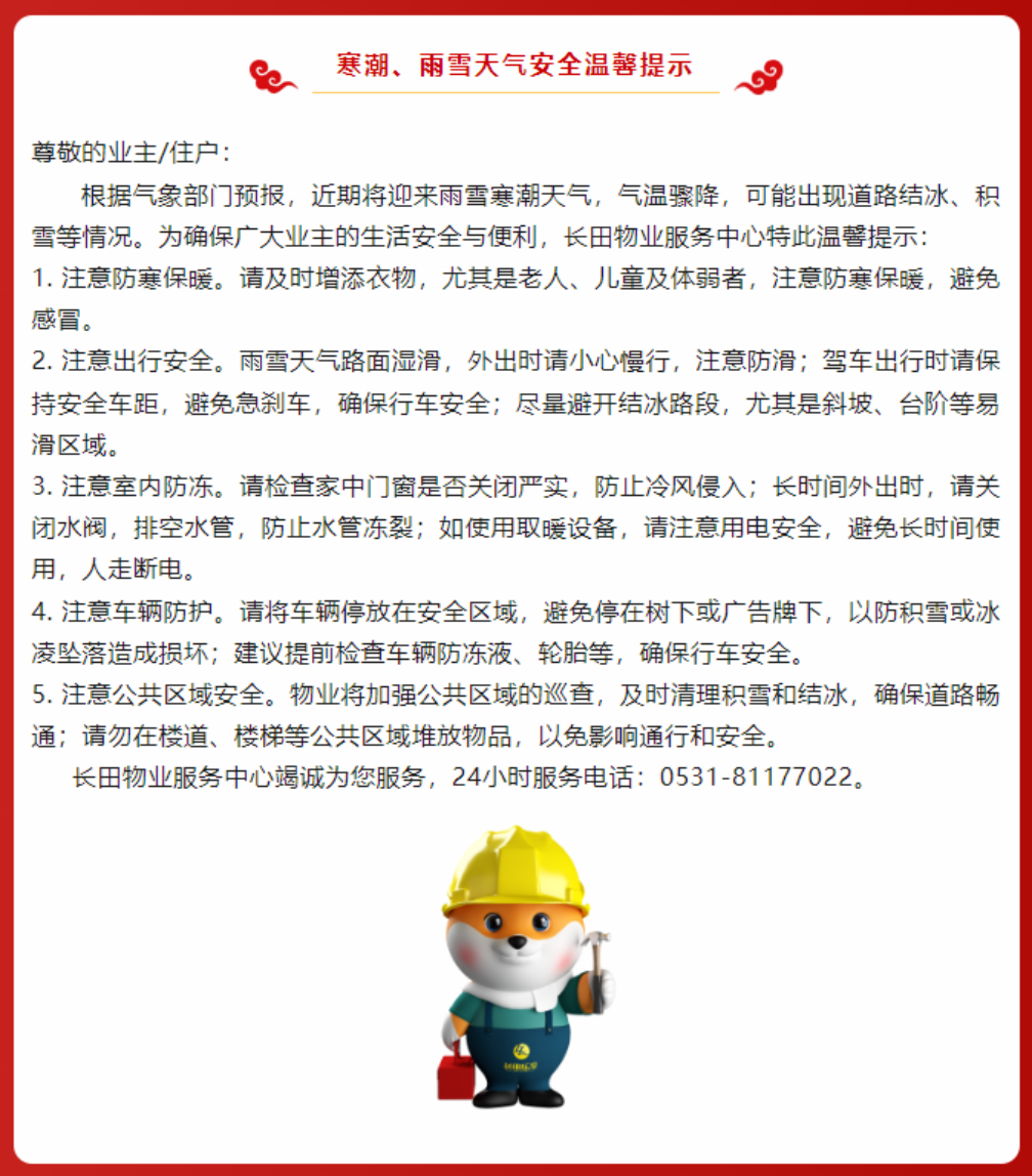 2月28日開(kāi)始,長(cháng)田物業(yè)通過(guò)微信群、公眾號等宣傳方式,將氣象預警信息廣泛及時(shí)推送給業(yè)主,做好全面排查、加強災害防范,有效應對極端天氣可能引發(fā)的各項安全問(wèn)題;降雪當日,物業(yè)主要負責同志全天在崗在位進(jìn)行統一指揮、抓好執行落實(shí)。各部門(mén)按職責落實(shí)防范措施,緊盯重要點(diǎn)位,及時(shí)巡查檢查,形成應急聯(lián)動(dòng)機制,同心協(xié)力打好應對強降雪攻堅戰,為業(yè)主和員工提供全天候安全保障。