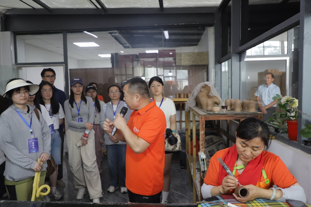 龍格黑陶藝術(shù)研究院內,傳統工藝與現代創(chuàng )新的完美融合。省級非物質(zhì)文化遺產(chǎn)項目代表性傳承人徐慶增老師帶領(lǐng)師生們參觀(guān)黑陶生產(chǎn)車(chē)間,他特別提到,濟陽(yáng)黑陶以黃河泥為原料,經(jīng)選土、拉坯、雕刻、燒制等20余道工序制成,其“黑如漆、亮如鏡”的獨特質(zhì)感源于高溫窯變的自然反應?,F場(chǎng)演示了拉坯、雕刻技藝,手中的陶土仿佛被賦予了生命,在指尖的舞動(dòng)下逐漸成型。師生們在專(zhuān)業(yè)藝人的指導下,從揉泥、拉坯到成型,親自體驗了黑陶的制作,最終創(chuàng )作出了屬于自己的黑陶作品。