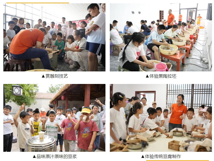 在課程研發(fā)中,基地主導打造“陶藝匠心”“非遺工坊”等特色項目,將濟陽(yáng)黑陶制作、傳統手工藝等非遺技藝融入教學(xué),讓傳統文化“可觸摸、可參與”。例如,在“陶藝匠心”課程中,學(xué)生可觀(guān)生產(chǎn)工藝、賞雕刻技藝和拉坯表演,更能親手制作黑陶器皿,感受黃河流域陶藝文化的千年底蘊;“古法豆腐”研學(xué)課程中,深入挖掘傳統豆腐制作工藝,讓學(xué)生親手參與從選豆、泡豆、磨漿、煮漿到點(diǎn)鹵、壓模的全過(guò)程,在實(shí)踐中體會(huì )傳統工藝的魅力。
