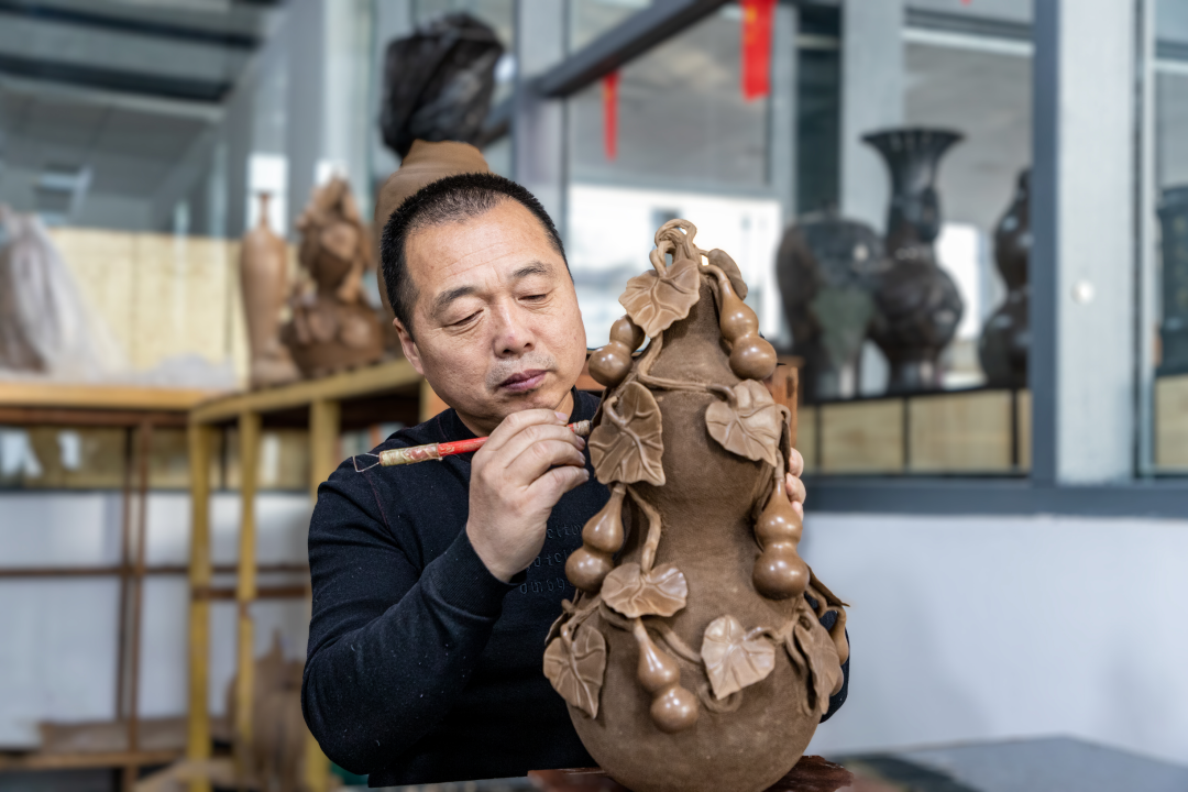 黑陶是華夏先民的黑色詩(shī)篇,作為土生土長(cháng)的濟陽(yáng)人,三十余載光陰里,徐慶增潛心研究黑陶,續寫(xiě)這光輝的詩(shī)篇。如今,他的作品早已超越實(shí)用范疇,成為兼具藝術(shù)價(jià)值與文化厚度的非遺名片?!洱堯v盛世》以華夏龍為魂,將泥與火的淬煉推向極致?!陡酆J》造型圓潤飽滿(mǎn),釉色沉郁如墨玉,無(wú)需多言,一抹玄色間,福氣已悄然落定?!豆淖友砀琛穭t將田間地頭的歡騰瞬間凝固于陶面,讓人仿佛聽(tīng)見(jiàn)咚咚的鼓點(diǎn),看見(jiàn)祖輩們在黃河邊舞出的煙火人間。這些凝聚著(zhù)心血的創(chuàng )作,不僅是他個(gè)人的藝術(shù)成就,更成為高校非遺教學(xué)中鮮活的教材。